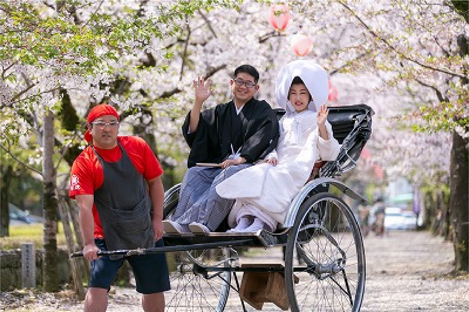 人力車に乗って一周してこられました。桜が舞い降りる中を、日本ならではの景色です。